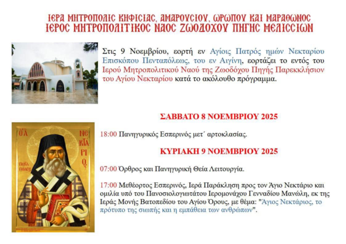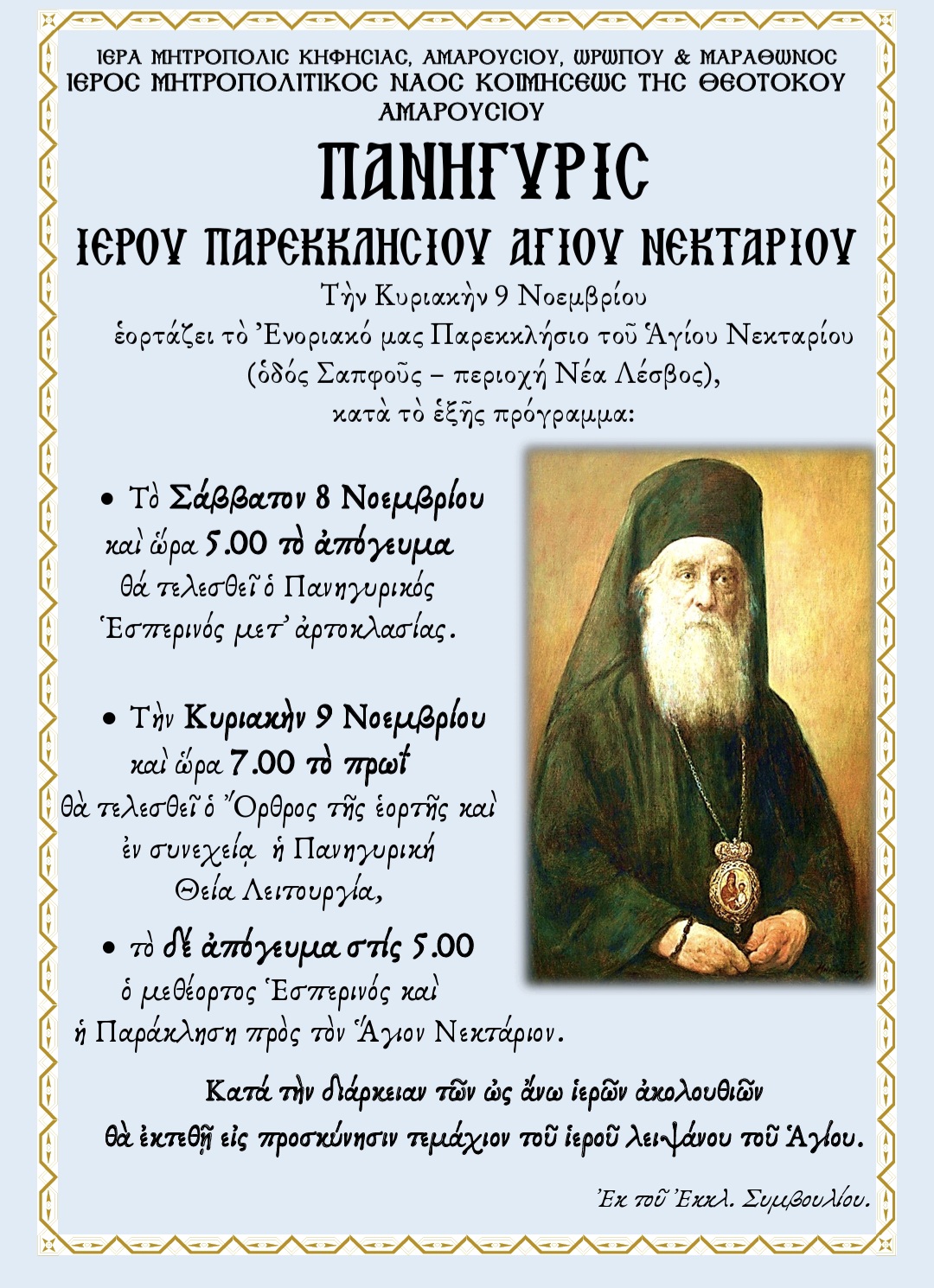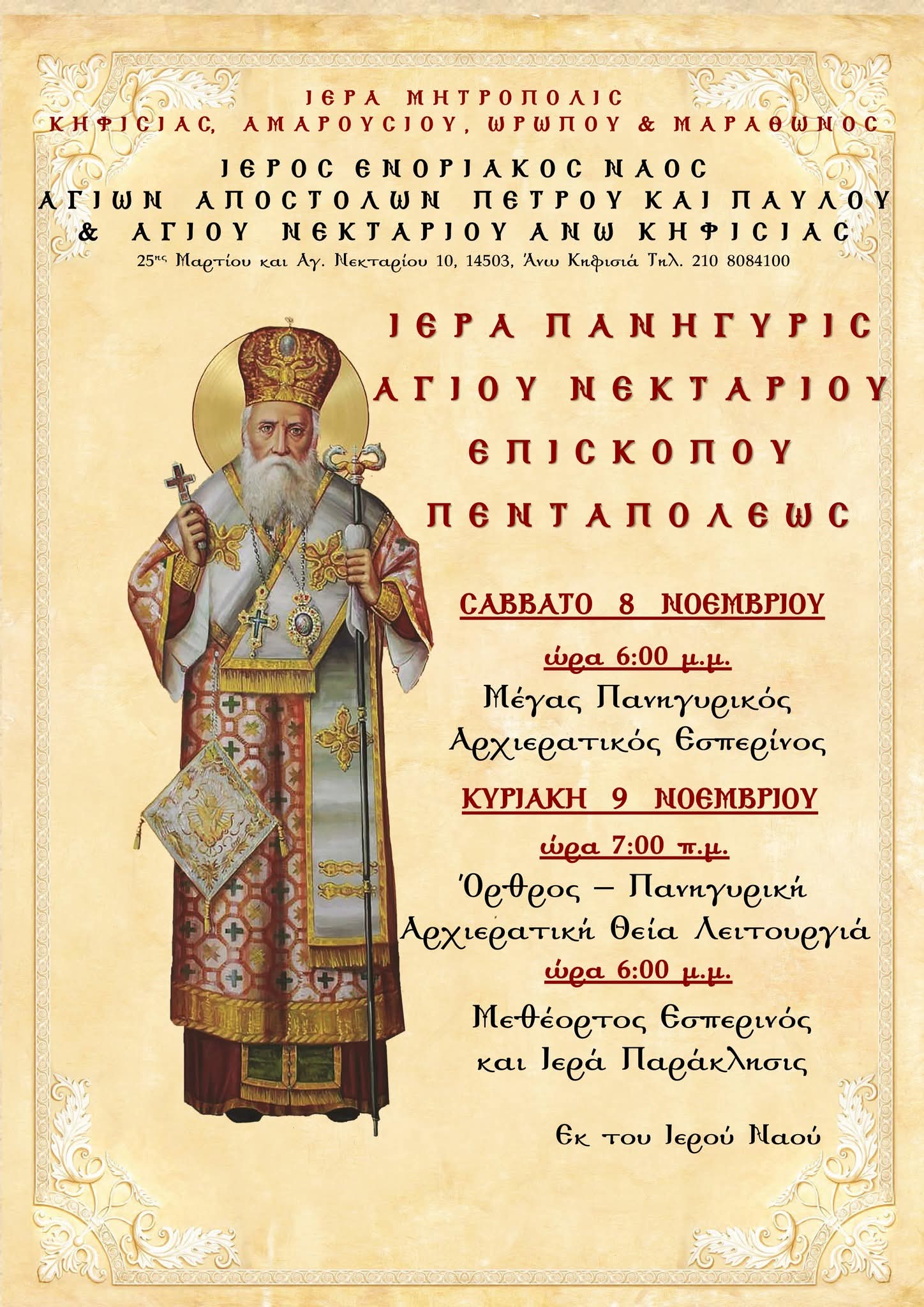 Προγράμματα Ιερών Πανηγύρεων επί τη μνήμη του Αγίου Νεκταρίου