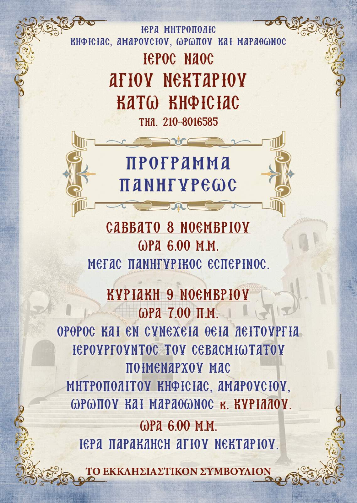 Προγράμματα Ιερών Πανηγύρεων επί τη μνήμη του Αγίου Νεκταρίου